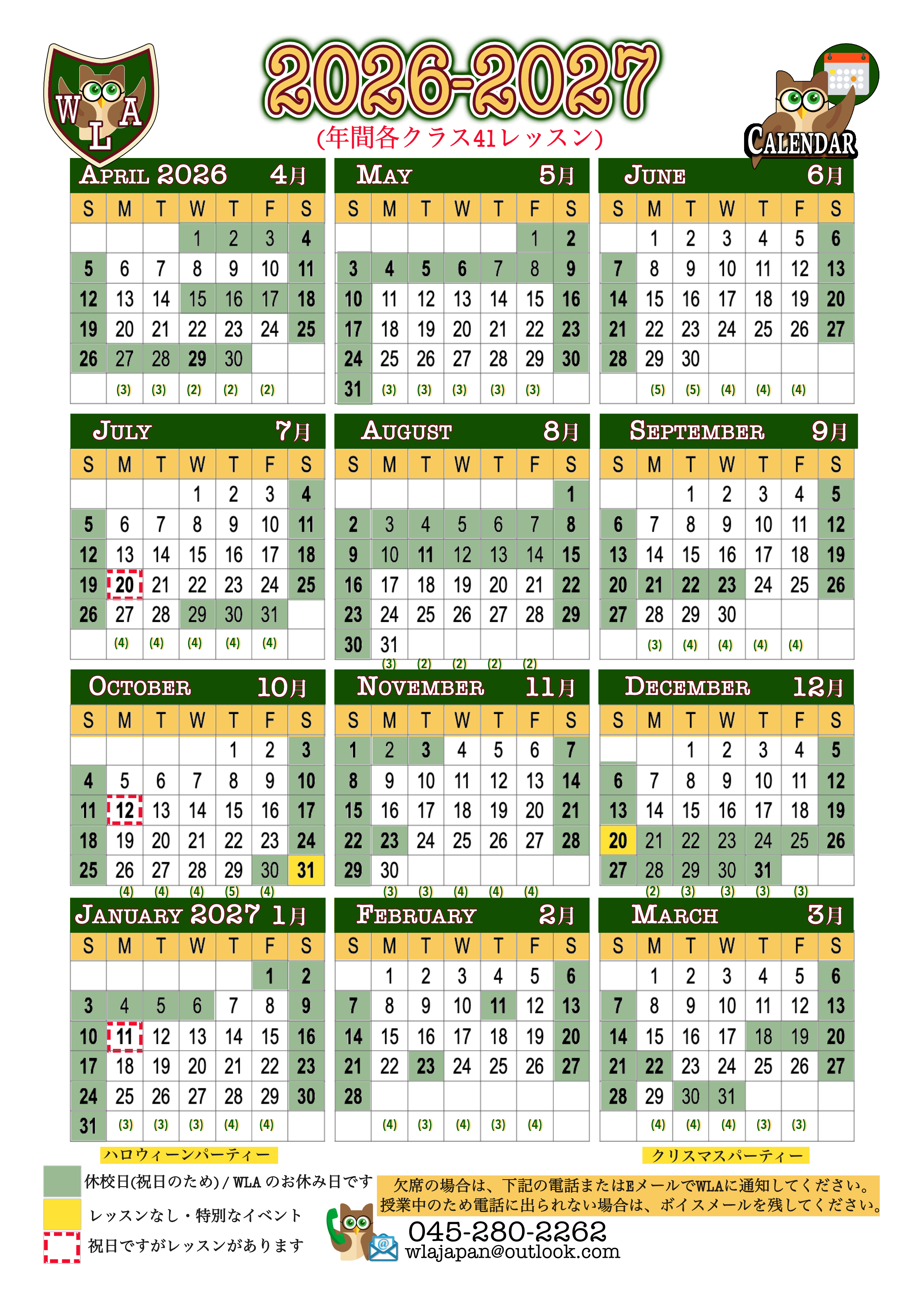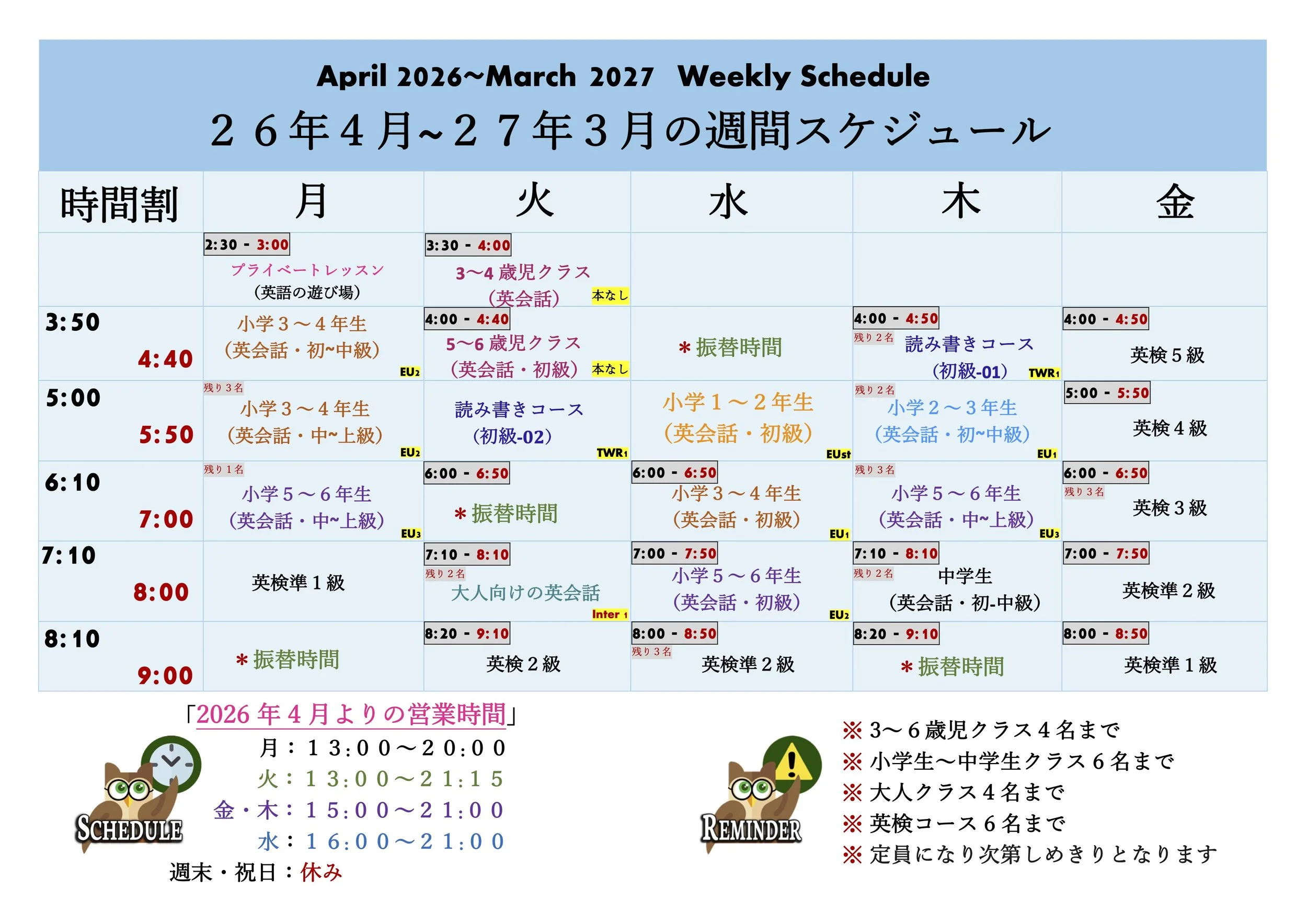 The new semester schedule starting from April 2026 is as shown below. Trial lessons are held outside of regular class times or on time slots with make-up lessons written on the schedule. Saturday trial lessons are only held in the morning. We are closed on Sundays. If you would like to schedule a weekday trial lesson but at a different time, please feel free to make a reservation by phone.